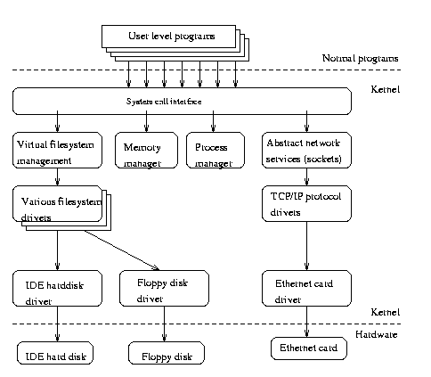 The Linux kernel consists of several important parts: process management, memory management, hardware device drivers, filesystem drivers, network management, and various other bits and pieces. Figure 2-1 shows some of them.